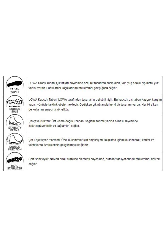 Yapısı: enjeksiyon taban Üst kısım: yarma deri, 1.4-1.6 mm Kopça: kapalı kopça Astar: gore-Tex® vision 3ly Taban: lowa cross Üst yüksekliği: 215/250 Ağırlığı: 1260 gr/çift (42 numara baz alınmıştır)